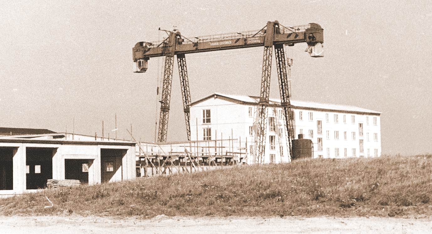 Die Montage der Großplatten erfolgte damals mit dem mittlerweile schon fast berühmten Portalkran (Montage-Bockkran), der vom VEB Kranbau Eberswalde konstruiert und gebaut wurde. Dieser Kran vermochte Lasten bis zu 6,4 Tonnen etwa 20 Meter hoch über sein Gleis zu heben. Foto: Ulrich Noack / stadtmuseum